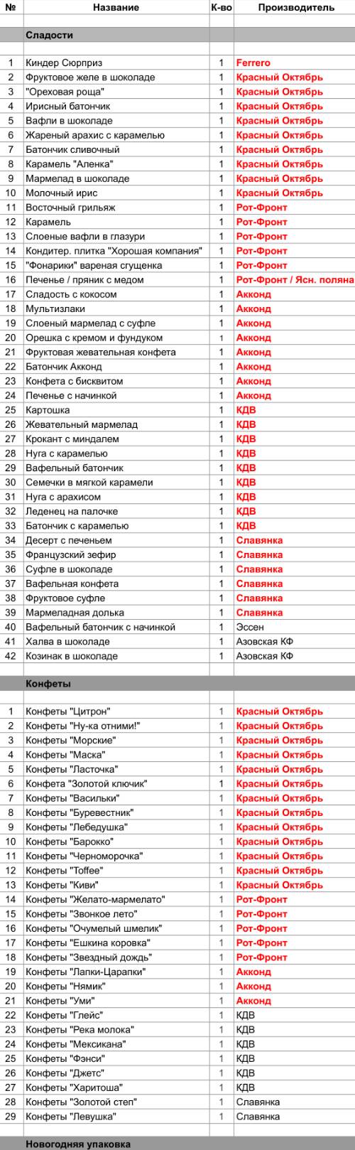 Фруктовое желе в шоколаде (1 шт), "Ореховая роща" (1 шт), Ирисный батончик (1 шт), Вафли в шоколаде (1 шт), Жареный арахис с карамелью (1 шт), Батончик сливочный (1 шт), Карамель "Аленка" (1 шт), Мармелад в шоколаде (1 шт), Молочный ирис (1 шт), Конфеты "Цитрон" (1 шт), Конфеты "Ну-ка отними!" (1 шт), Конфеты "Морские" (1 шт), Конфеты "Маска" (1 шт), Конфеты "Ласточка" (1 шт), Конфета "Золотой ключик" (1 шт), Конфеты "Васильки" (1 шт), Конфеты "Буревестник" (1 шт), Конфеты "Лебедушка" (1 шт), Конфеты "Барокко" (1 шт), Конфеты "Черноморочка" (1 шт), Конфеты "Toffee" (1 шт), Конфеты "Киви" (1 шт)