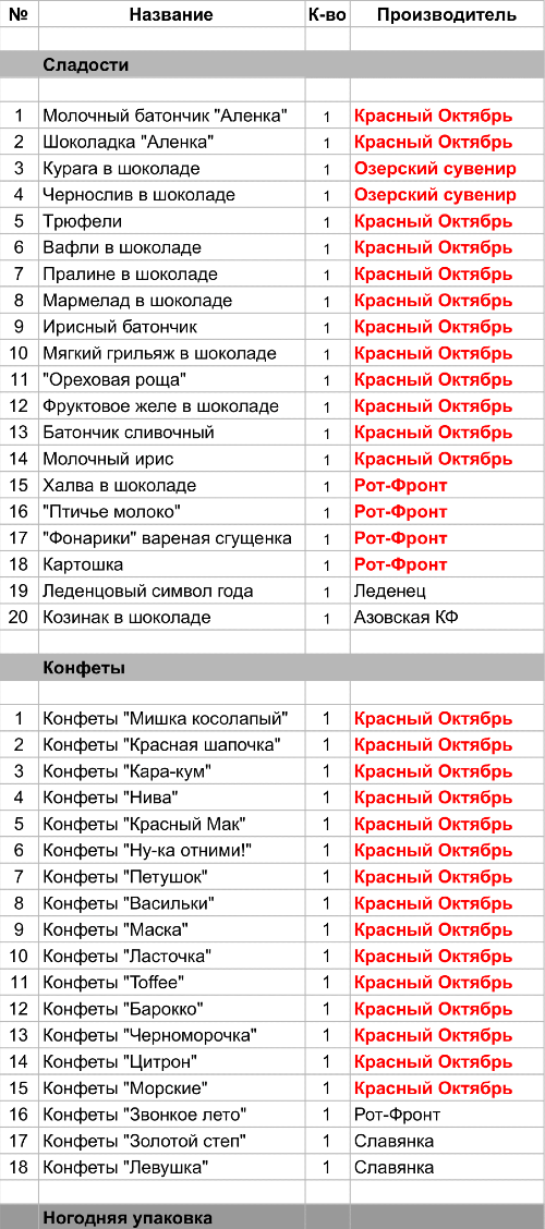 Молочный батончик "Аленка" (1 шт), Шоколадка "Аленка" (1 шт), Трюфели (1 шт), Вафли в шоколаде (1 шт), Пралине в шоколаде (1 шт), Мармелад в шоколаде (1 шт), Ирисный батончик (1 шт), Мягкий грильяж в шоколаде (1 шт), "Ореховая роща" (1 шт), Фруктовое желе в шоколаде (1 шт), Батончик сливочный (1 шт), Молочный ирис (1 шт), Конфеты "Мишка косолапый" (1 шт), Конфеты "Красная шапочка" (1 шт), Конфеты "Кара-кум" (1 шт), Конфеты "Нива" (1 шт), Конфеты "Красный Мак" (1 шт), Конфеты "Ну-ка отними!" (1 шт), Конфеты "Петушок" (1 шт), Конфеты "Васильки" (1 шт), Конфеты "Маска" (1 шт), Конфеты "Ласточка" (1 шт), Конфеты "Toffee" (1 шт), Конфеты "Барокко" (1 шт), Конфеты "Черноморочка" (1 шт), Конфеты "Цитрон" (1 шт), Конфеты "Морские" (1 шт)